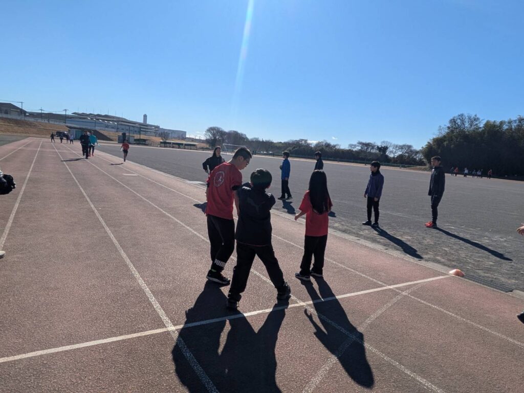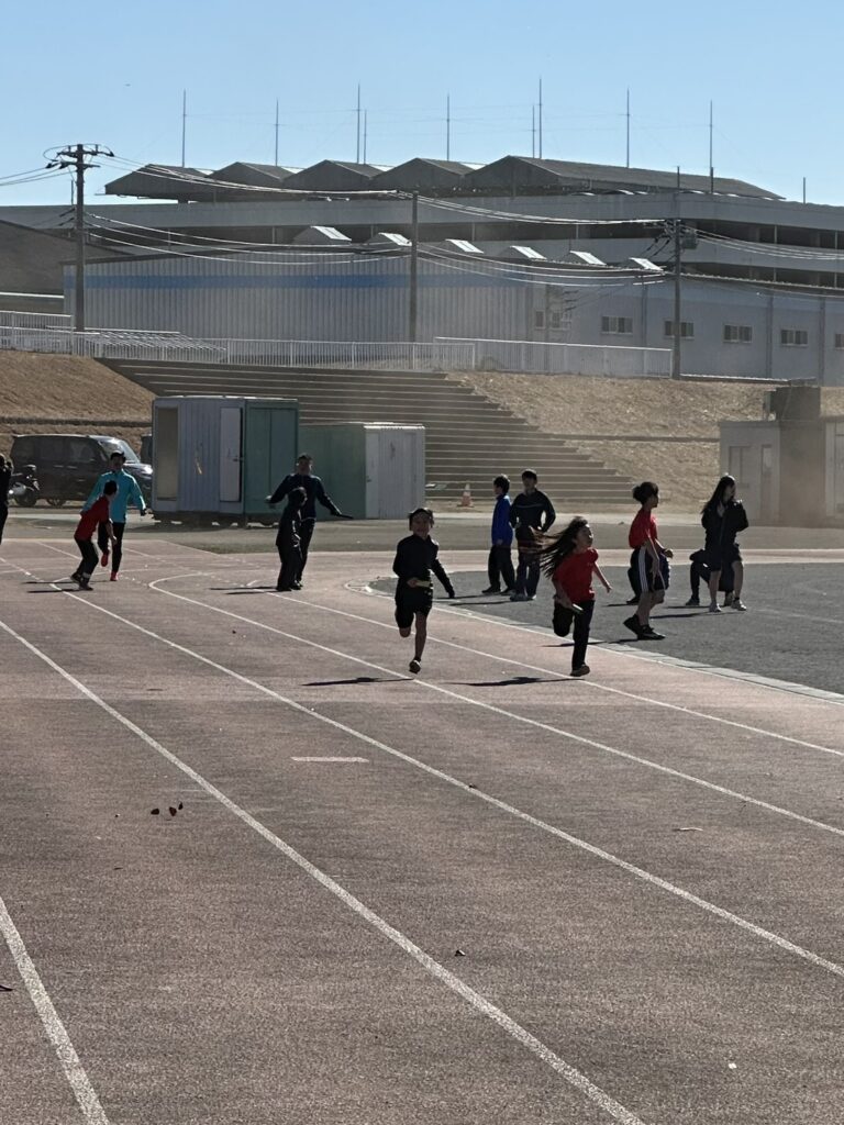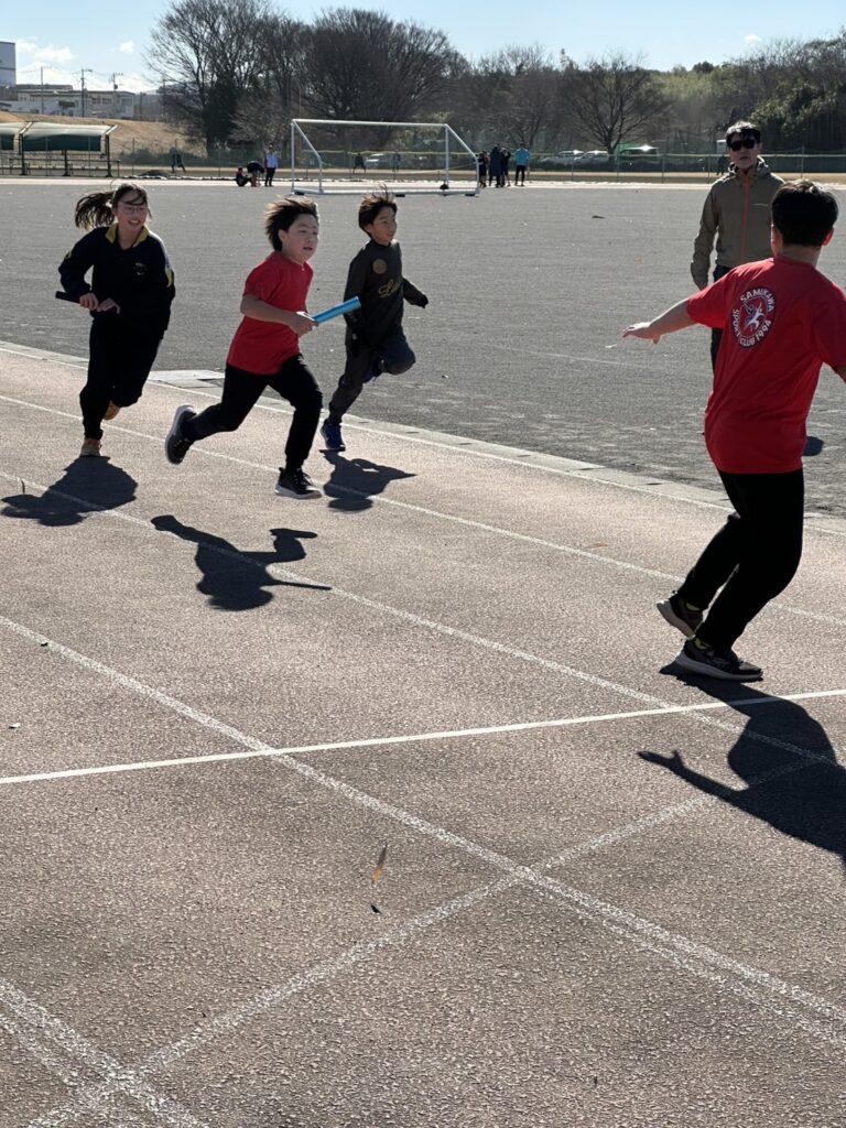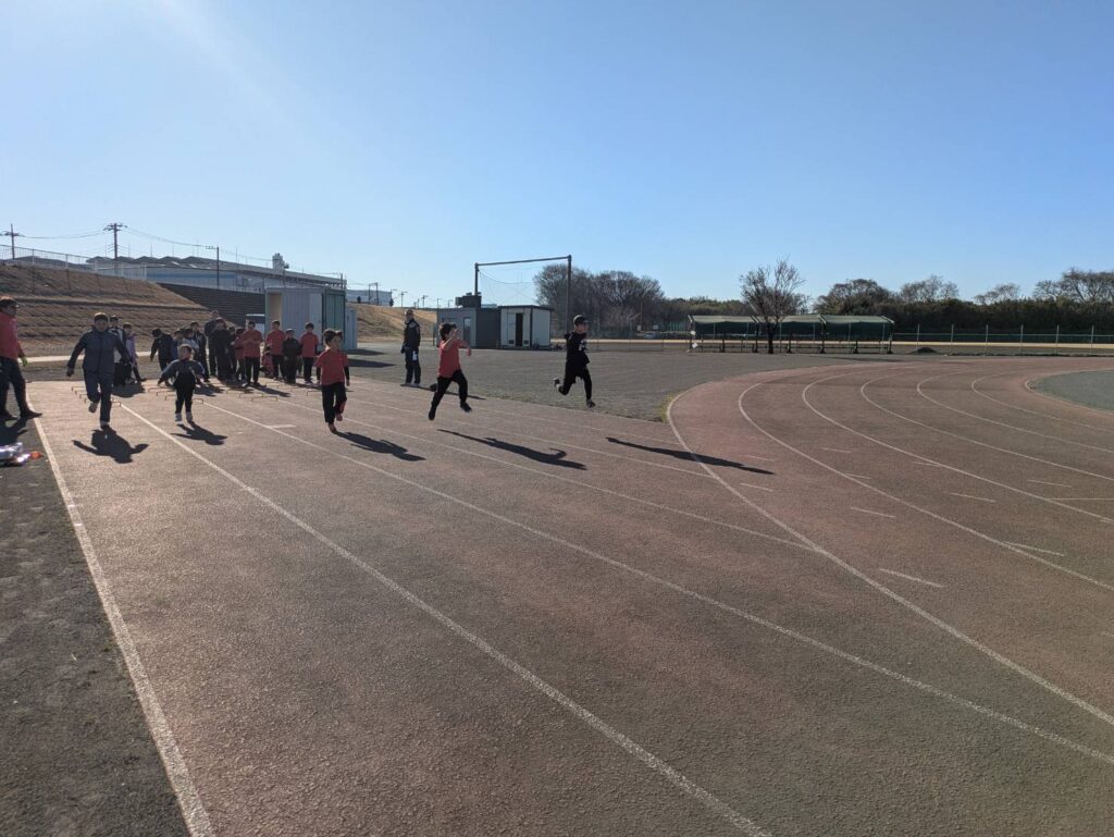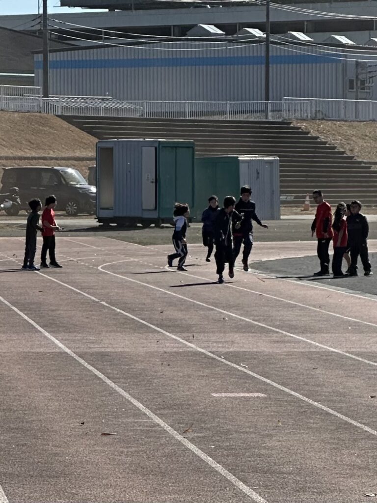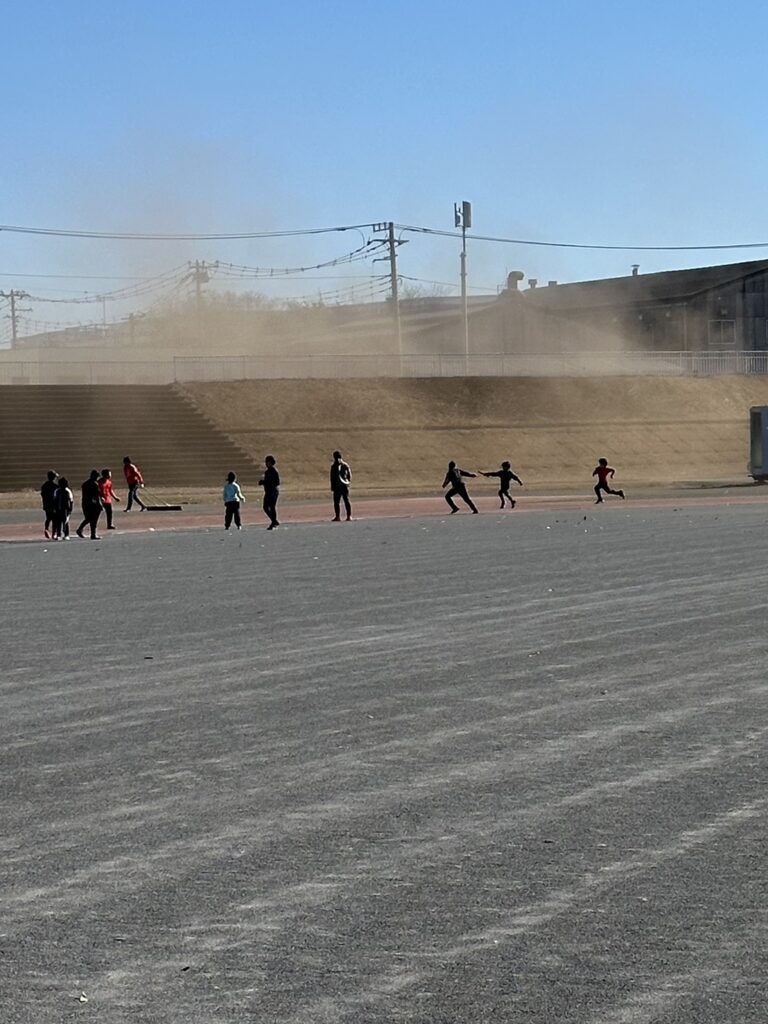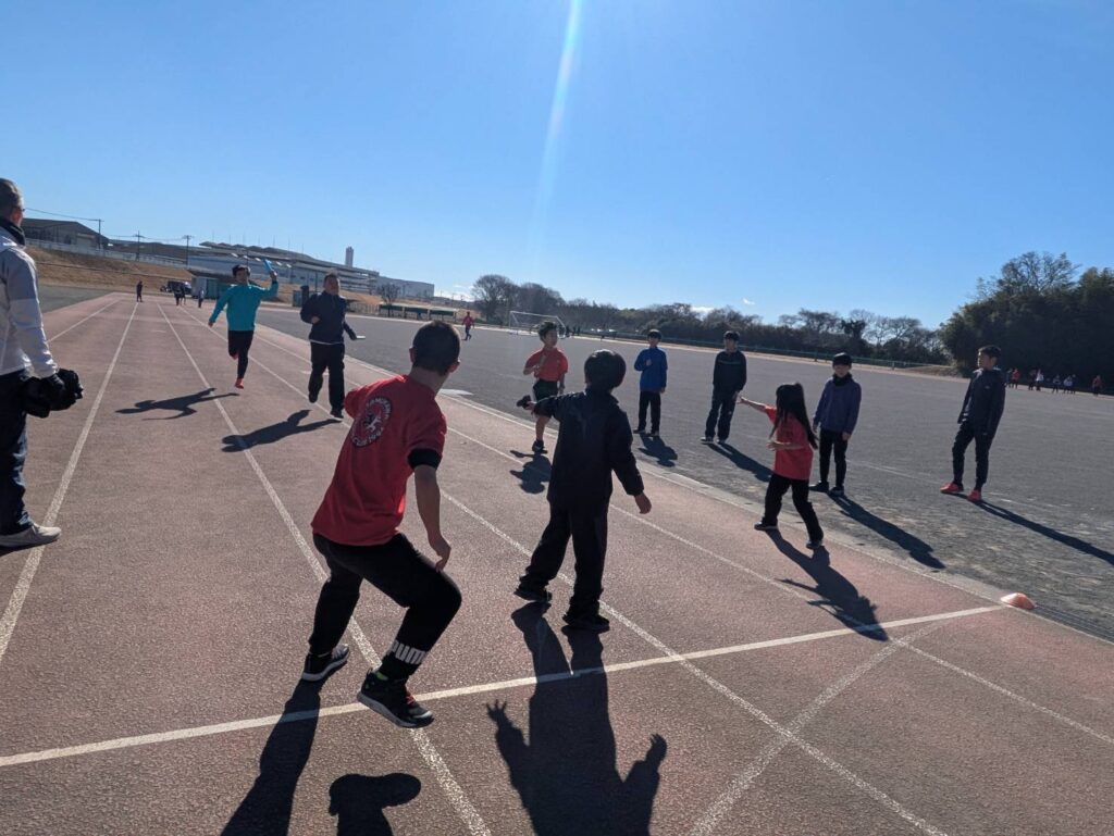 途中からは風が強まり、砂埃が舞う時間帯もありましたが、参加人数も多く、リレーは11人×4チームと賑やかな練習会となりました