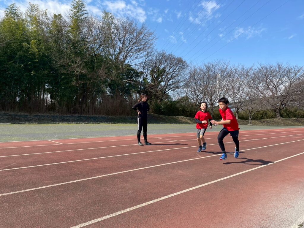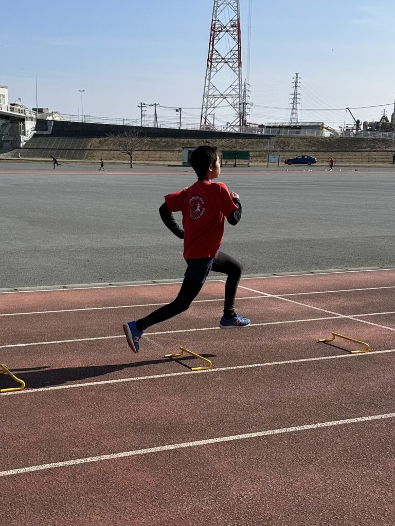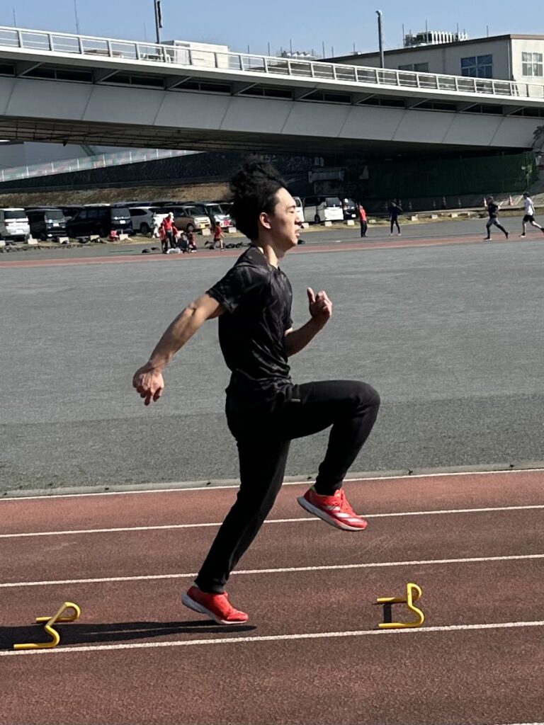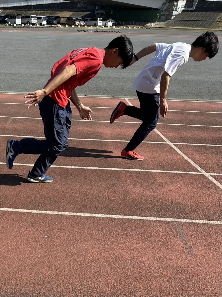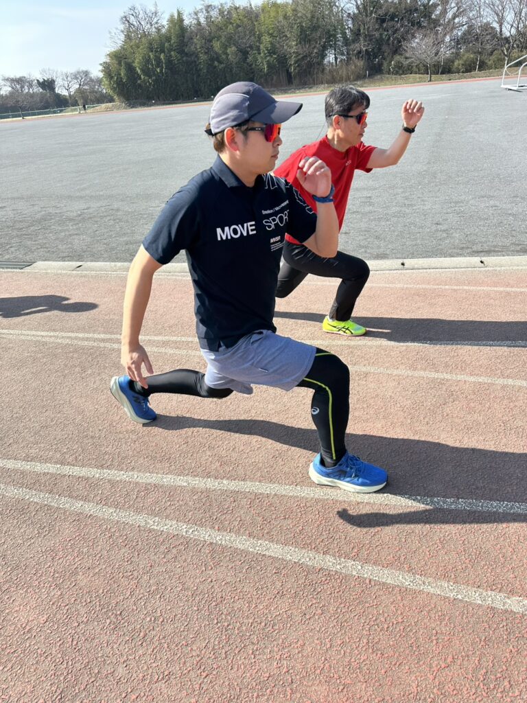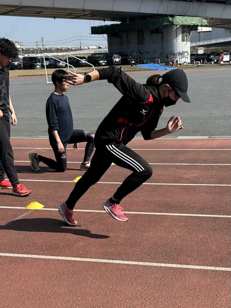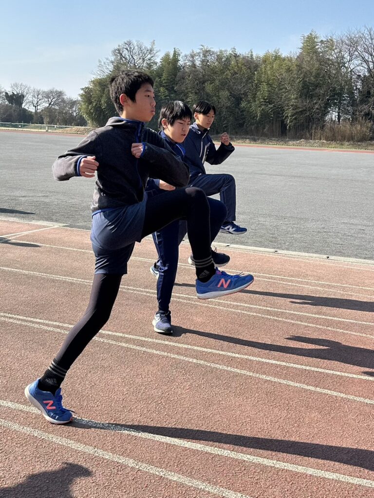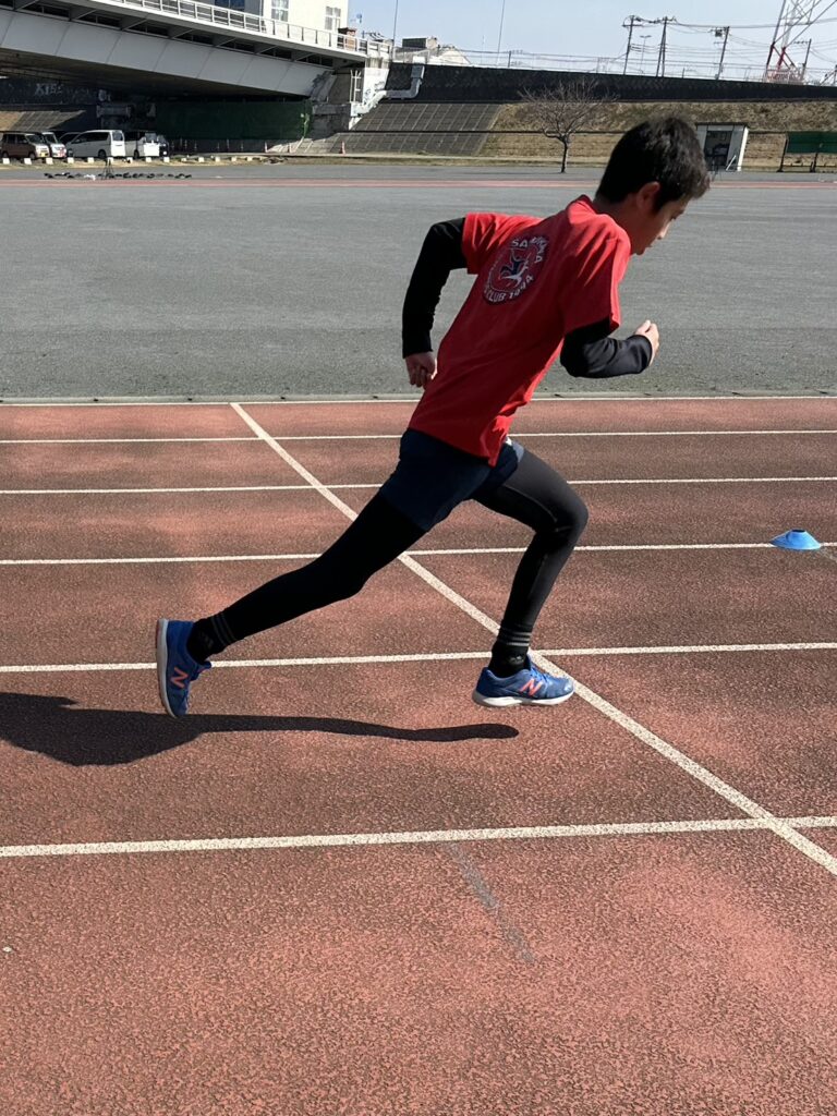ハーフニーのスタート練習は3歩目までの上体と脛の角度に注意して取り組みます。