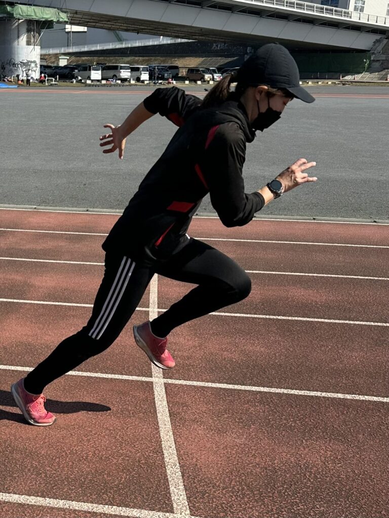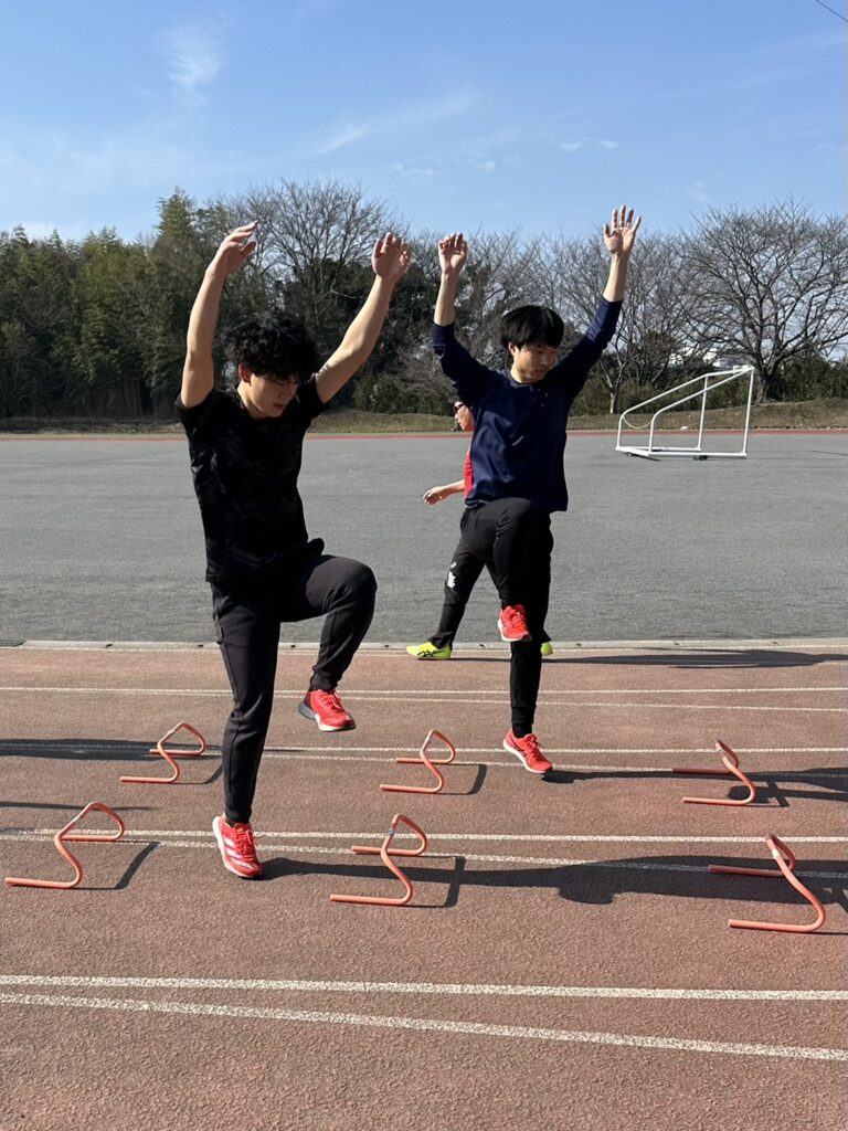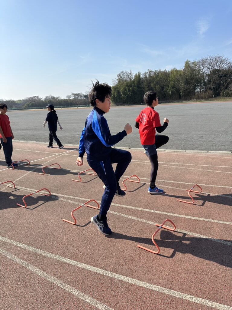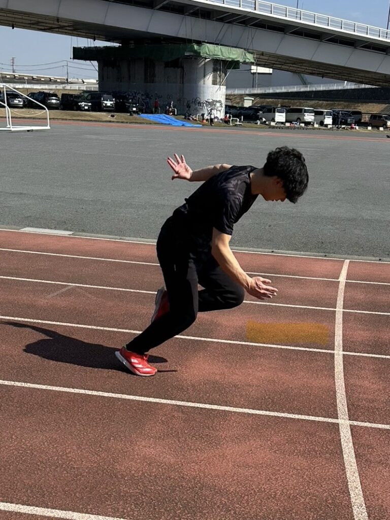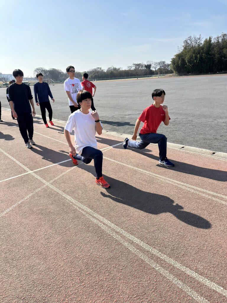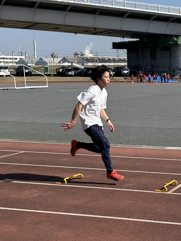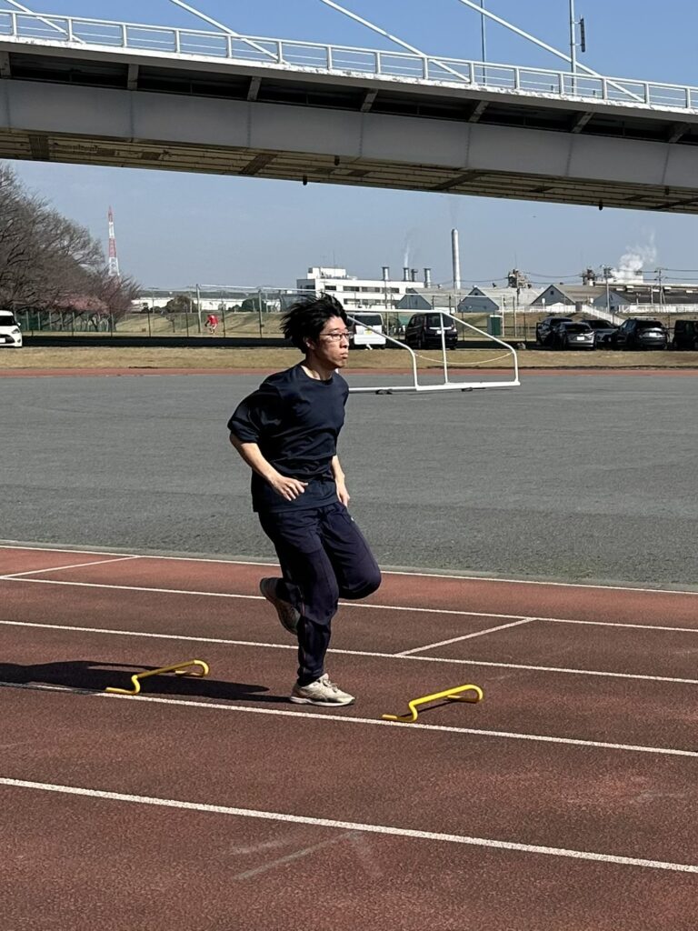 ハーフニーのスタート練習は3歩目までの上体と脛の角度に注意して取り組みます。