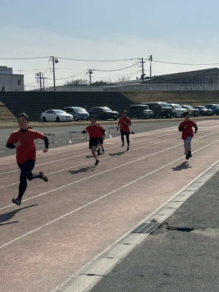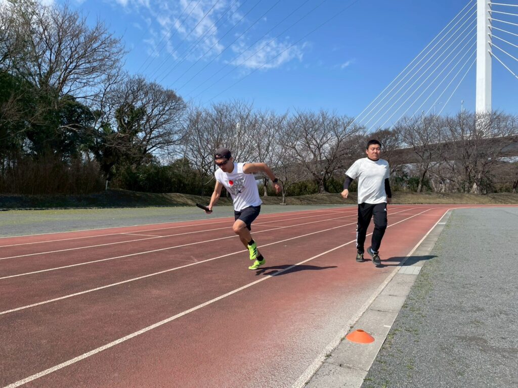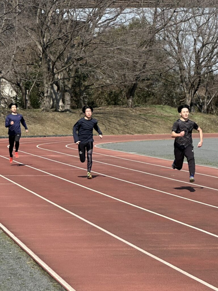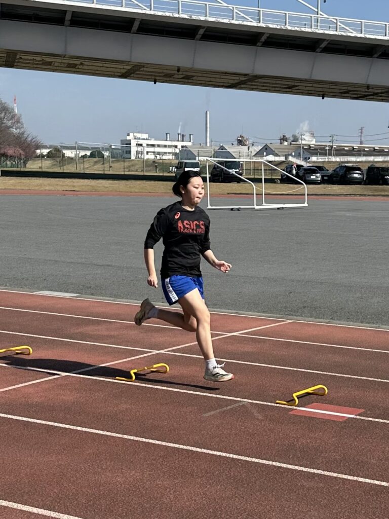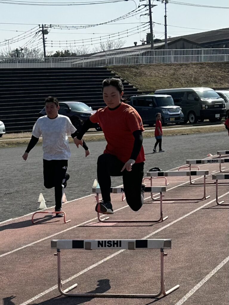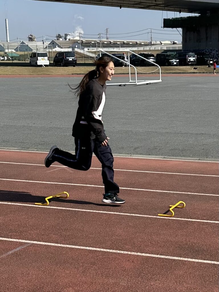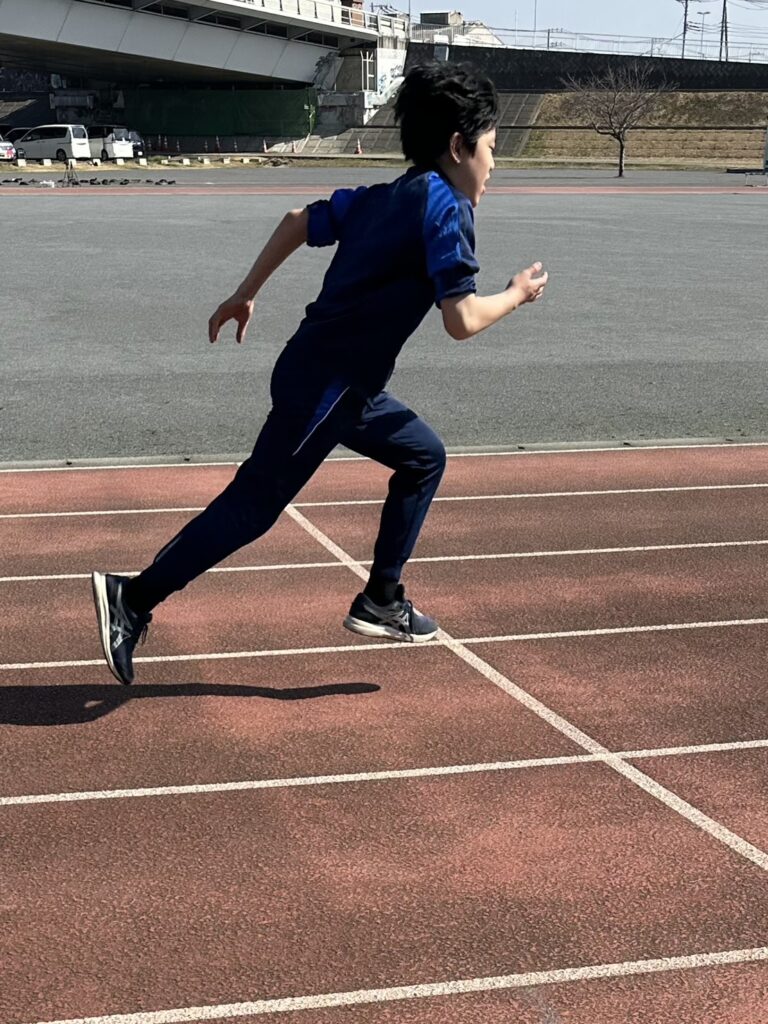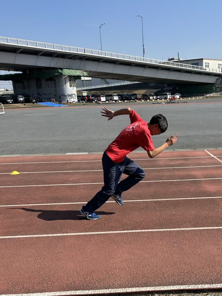 ハーフニーのスタート練習は3歩目までの上体と脛の角度に注意して取り組みます。