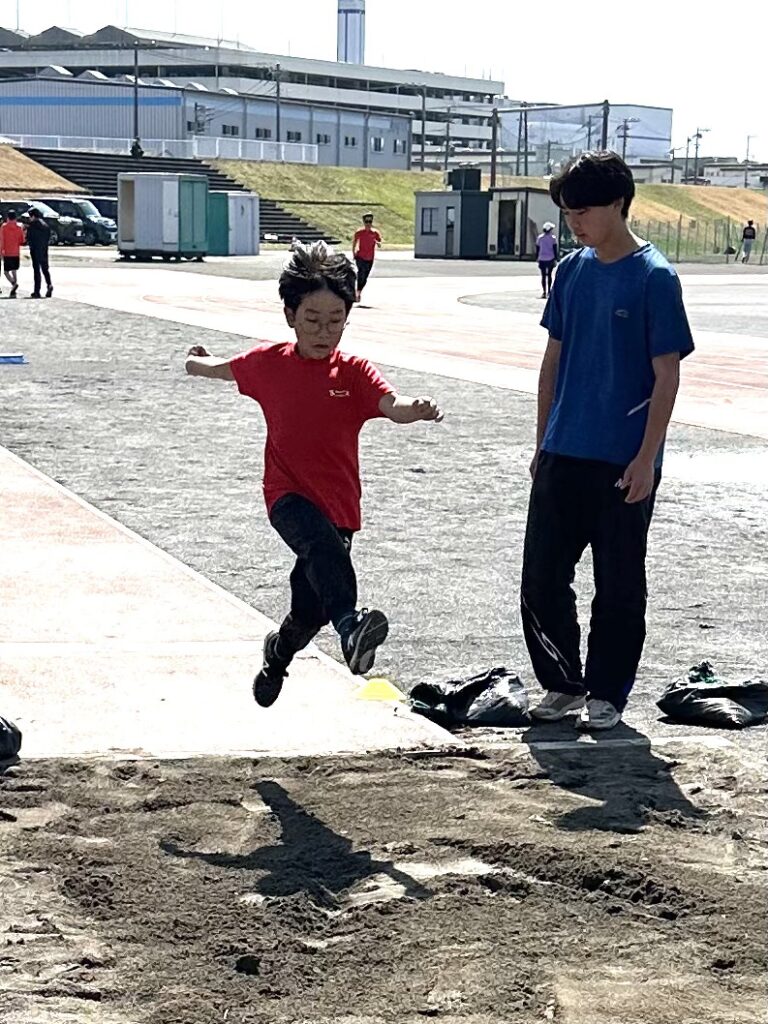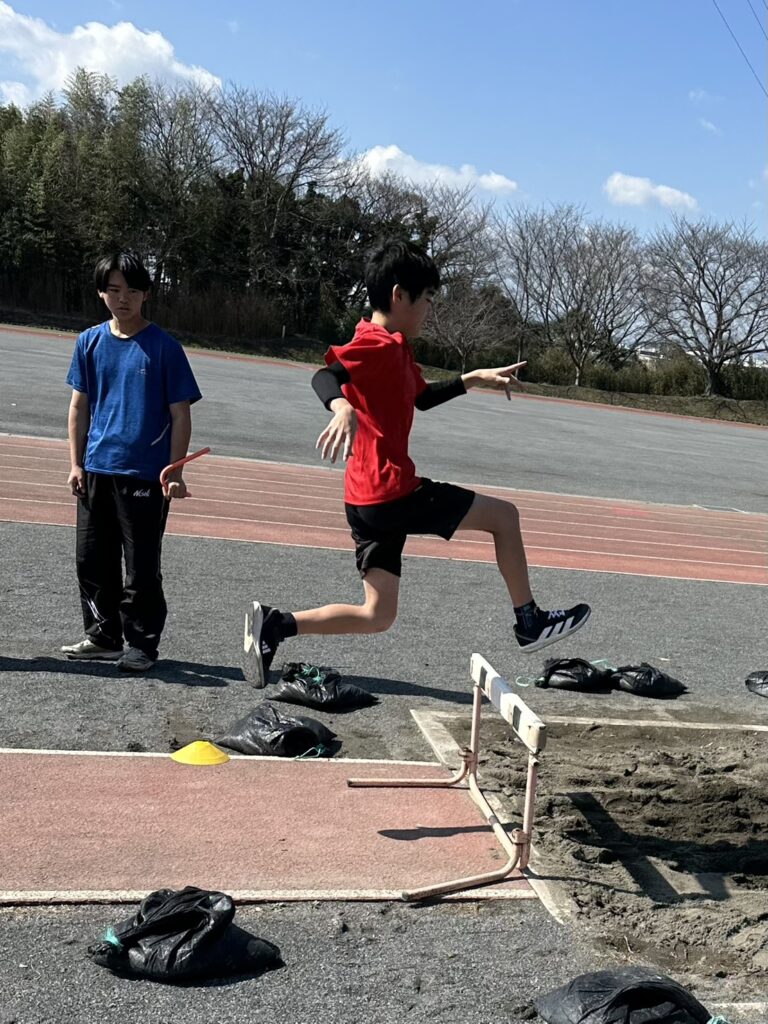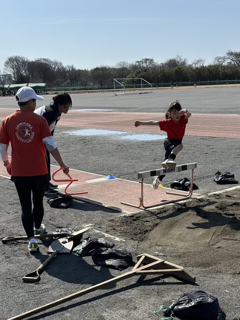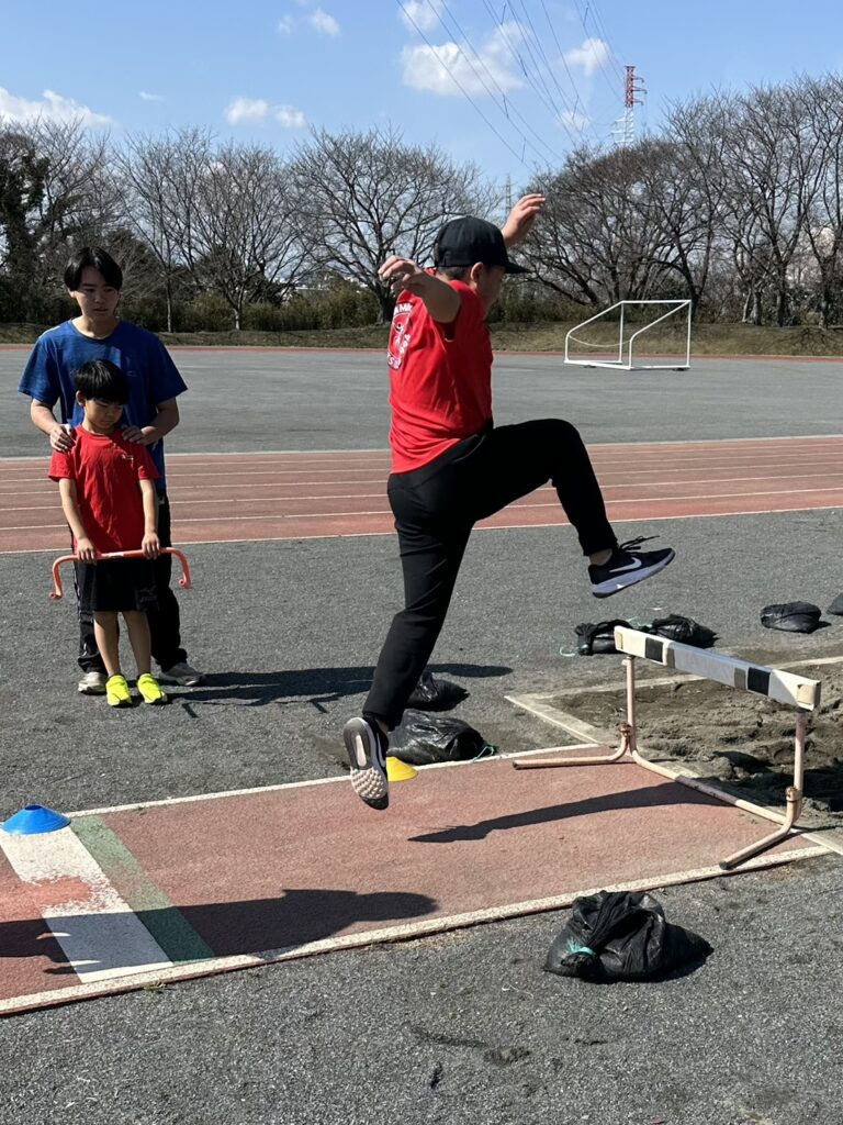 幅跳び。高く上がる意識を持つためにハードル使って踏み切り。