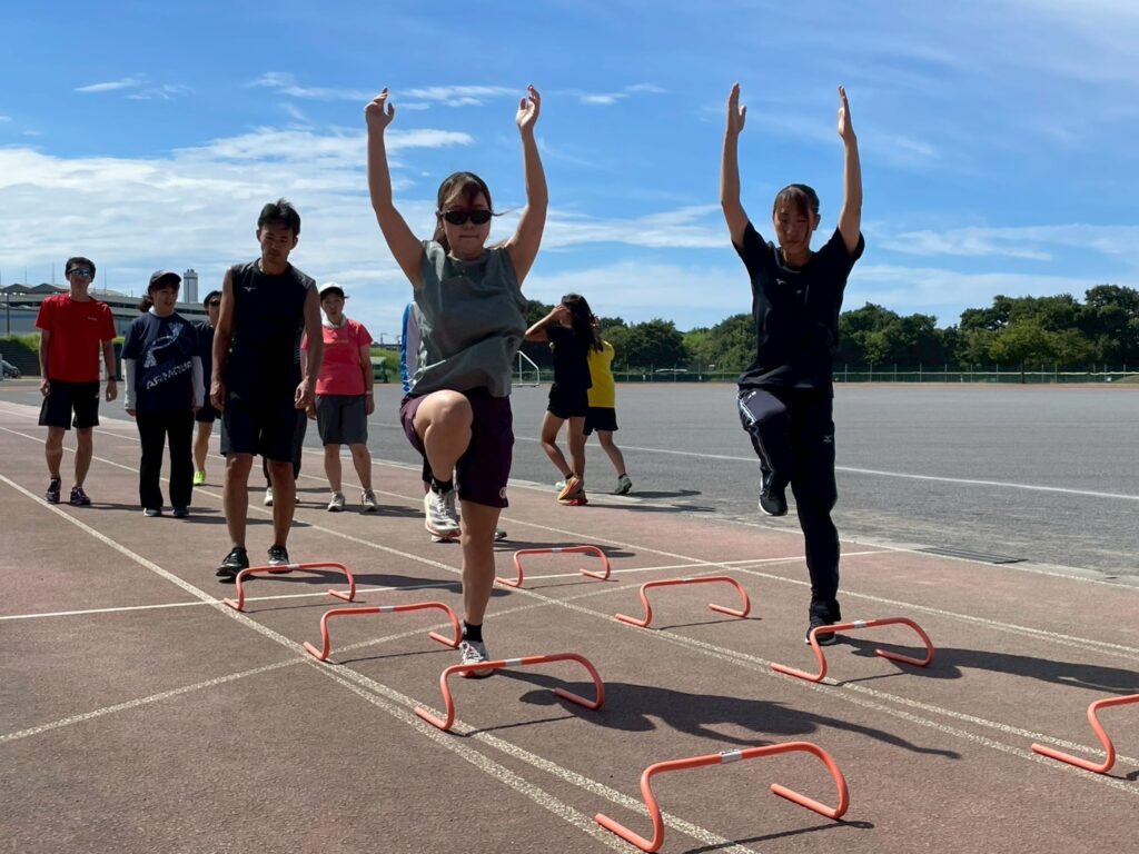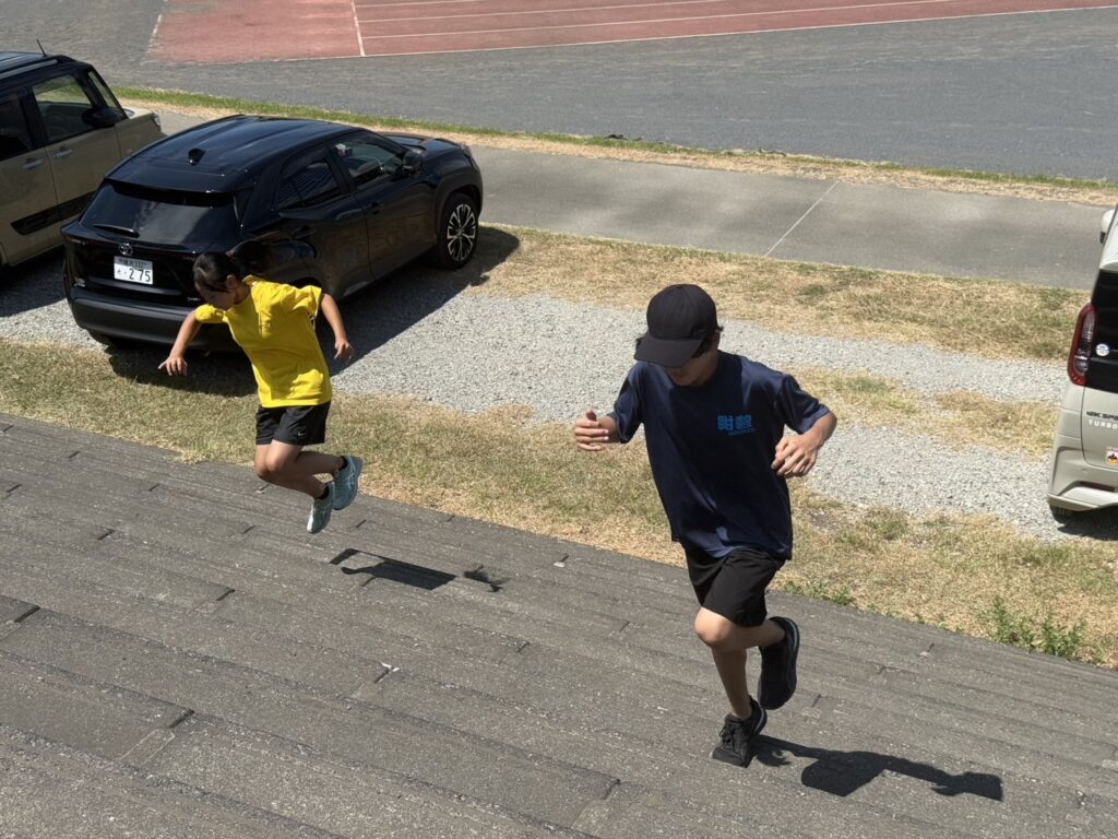 ジュニア・アスリートの跳躍・投擲ブロックの階段を使用したジャンプ補強の様子です・